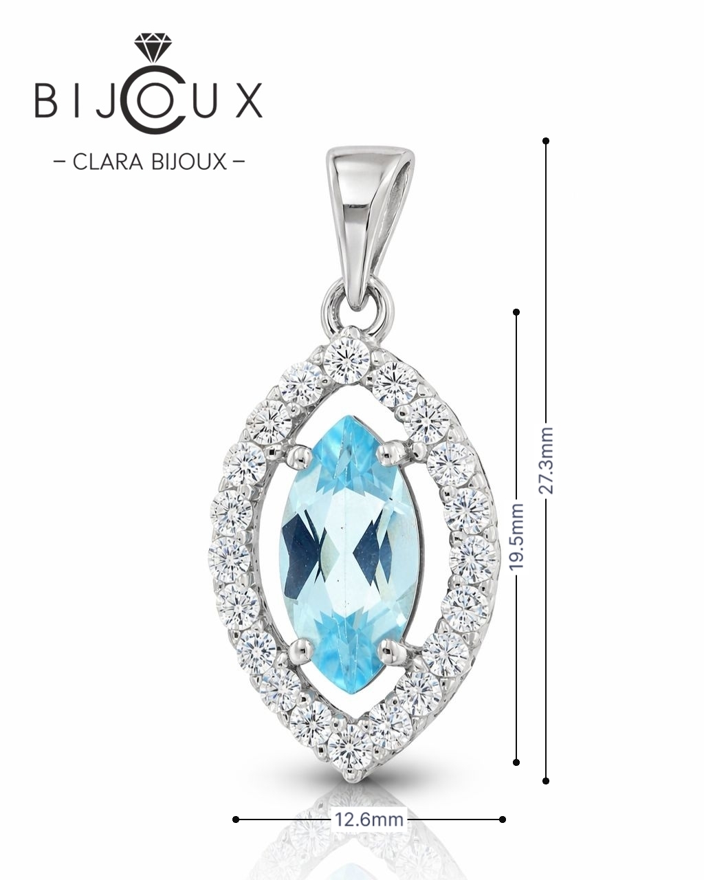 Синият топаз е изящно обрамчен от ред бели циркони (CZ), които подчертават формата му и създават сияен ореол около централния камък. Контрастът между свежия син цвят и чистия блясък на цирконите придава на висулката усещане за лекота, чистота и неподправена елегантност.