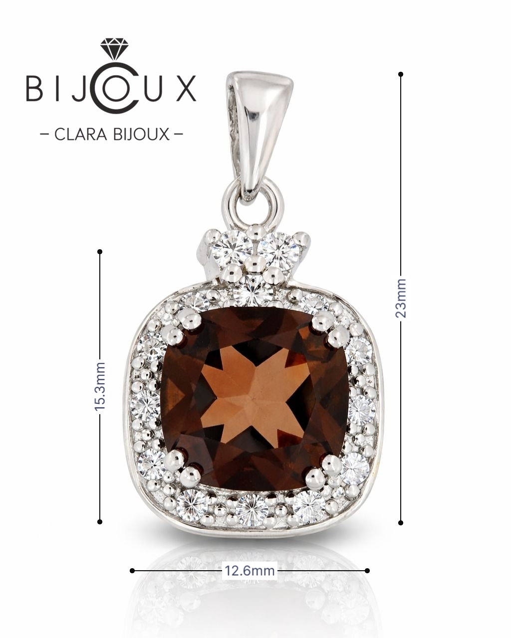 Висулката е изработена от родирано сребро проба 925, което осигурява устойчив блясък, защита от потъмняване и дълготрайна красота. Опушеният кварц е с квадратна форма и е прецизно фасетиран, за да улавя и отразява светлината по мек и изискан начин. Около него е разположен венец от бели циркони (CZ), които добавят фин контраст и луксозен завършек.