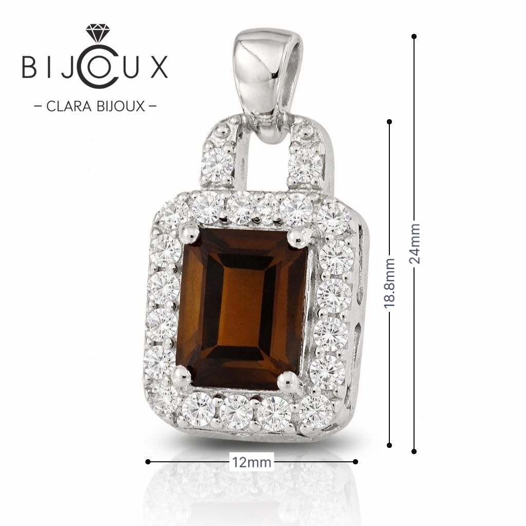 Тази изискана сребърна висулка с естествен опушен кварц впечатлява с балансирано съчетание между класически дизайн и луксозно излъчване. Централният камък е с правоъгълна форма (emerald cut), която подчертава дълбочината и топлите кафяви нюанси на опушения кварц. Камъкът е прецизно фасетиран, за да улавя светлината и да придава фин, но отчетлив блясък.