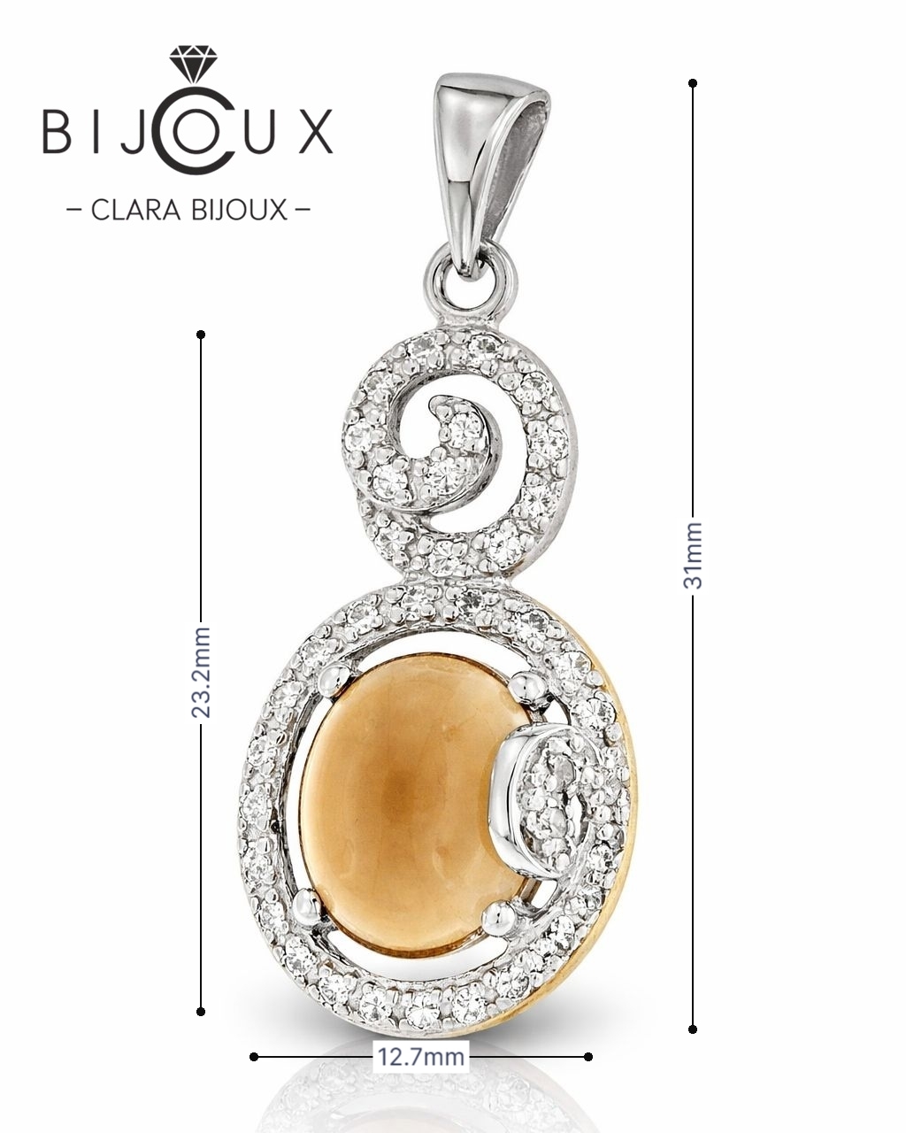 Висулката е изработена от родирано сребро проба 925, което осигурява устойчивост, защита от потъмняване и дълготраен блясък. Формата около камъка е подчертана с декоративен елемент със спираловиден мотив, обсипан с фини бели циркони (CZ). Те добавят деликатен контраст и подчертават централния кварц, без да отнемат от неговото присъствие.
