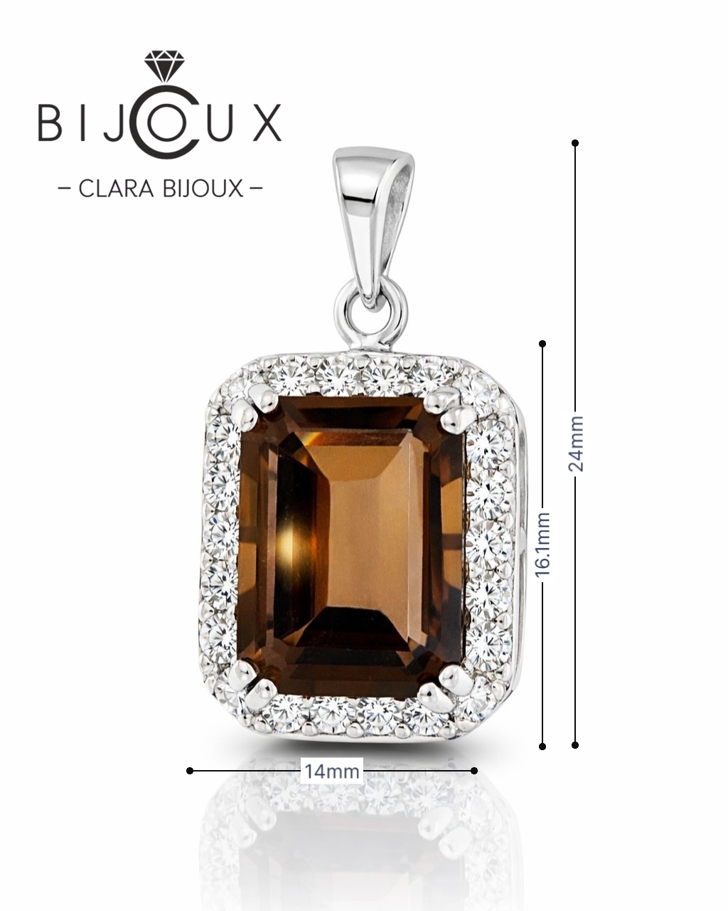 Ефектна сребърна висулка с естествен опушен кварц, изработена от родирано сребро проба 925. Квадратният камък е обрамчен от фини бели циркони. Верижка не е включена.