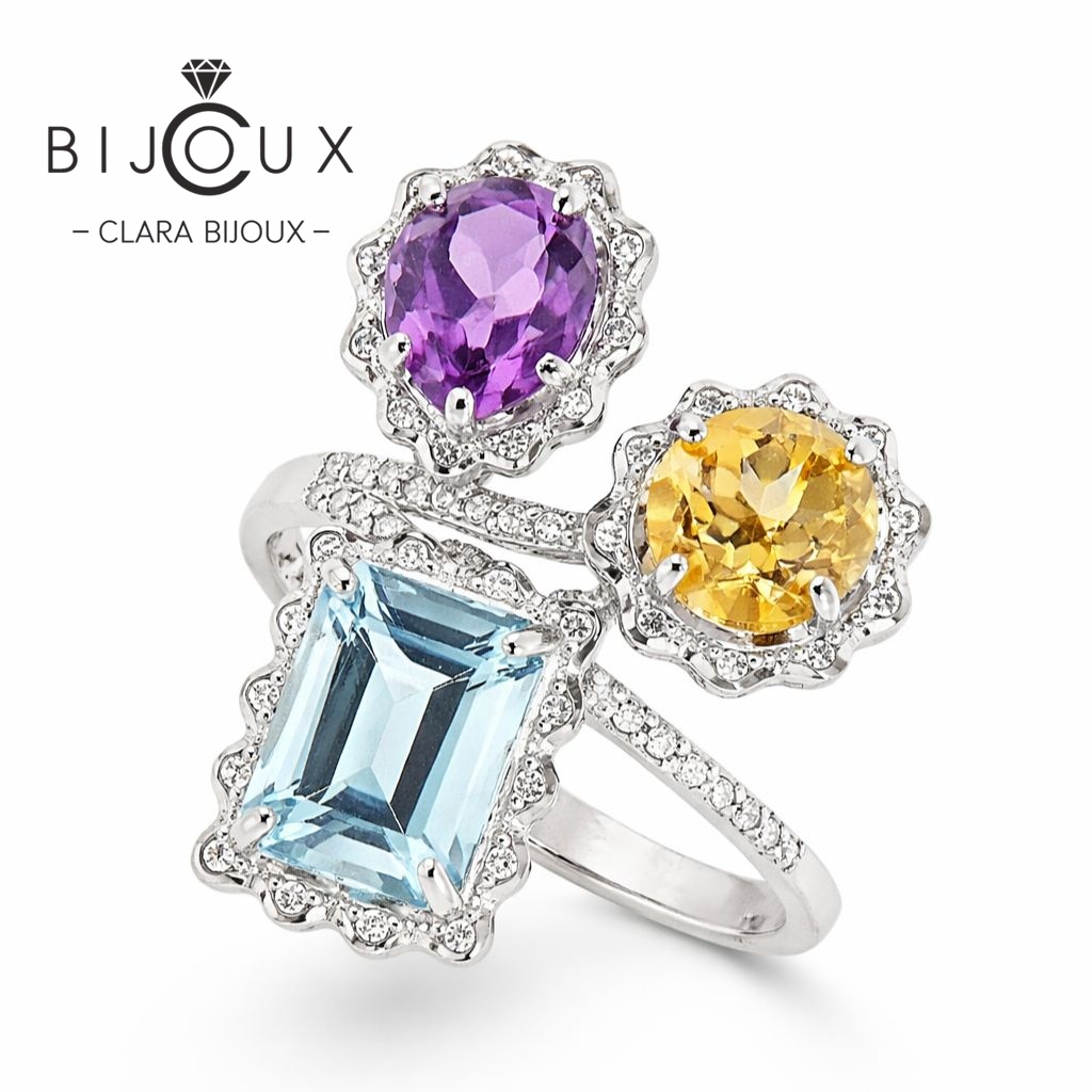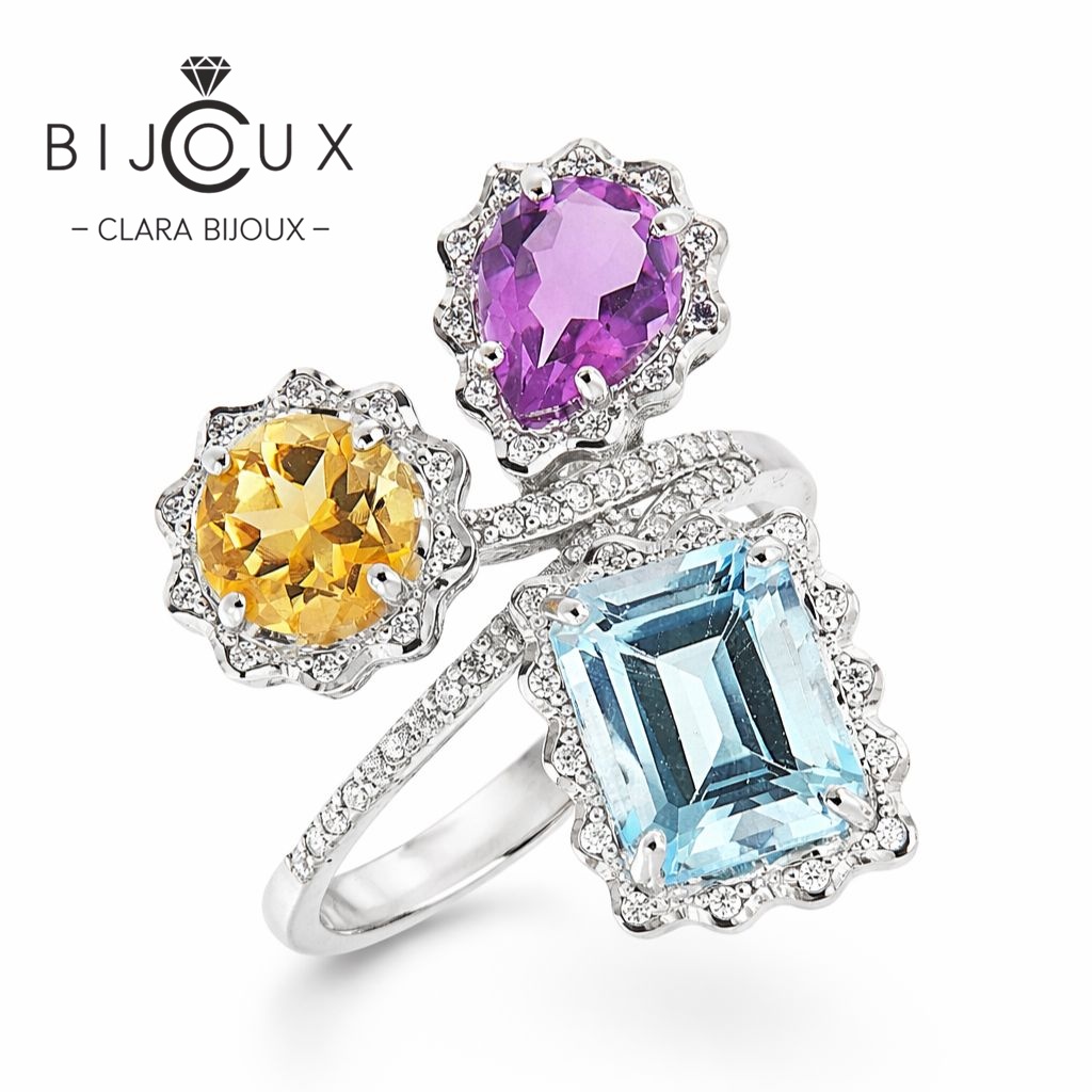 Изтънчен дамски пръстен с изящна изработка от родирано сребро, съчетаваща ефектно естествен син топаз, естествен цитрин и естествен аметист, заобиколени от циркони. Всички бижута са придружени от специален сертификат, удостоверяващ автентичността им. На този сертификат можем да изпишем и лично послание за Вас или за когото е бижуто.Всяка поръчка пристига при Вас луксозно опакована в брандирана кутийка и торбичка, готова за поднасяне като подарък.
