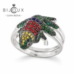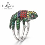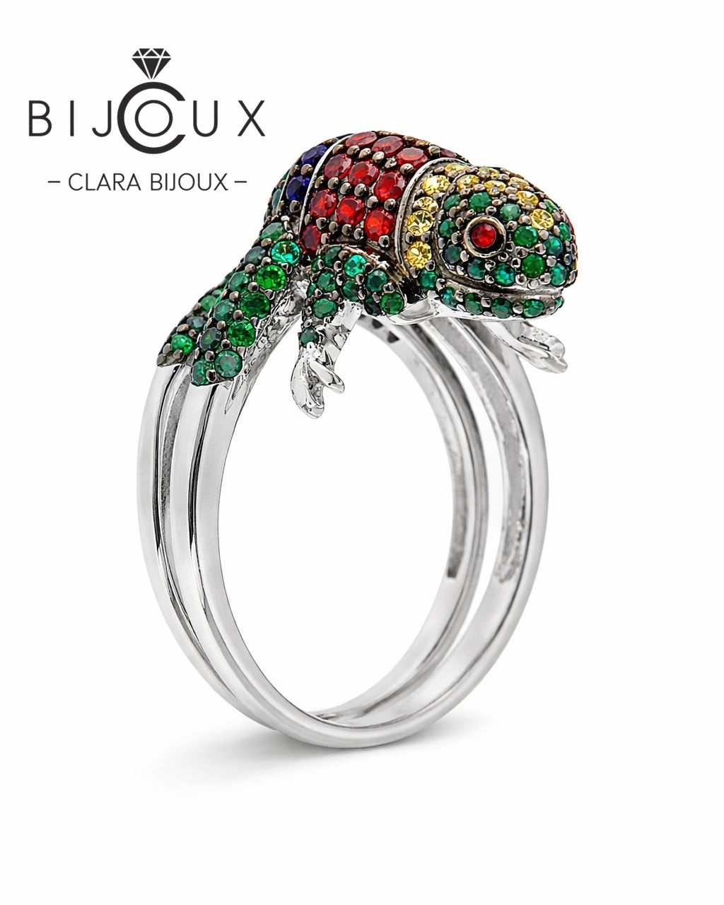 Сребърен пръстен с красив детайлно изработен хамелеон, обгръщащ пръста, който няма как да остане незабелязан върху ръката на всяка дама. Моделът е обсипан с цветни ръчно инкрустирани циркони, естествени гранати и естествени сапфири.Всички бижута са придружени от специален сертификат, удостоверяващ автентичността им. Всяка поръчка пристига при Вас луксозно опакована в брандирана кутийка и торбичка, готова за поднасяне като подарък.