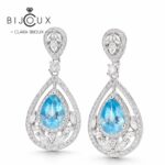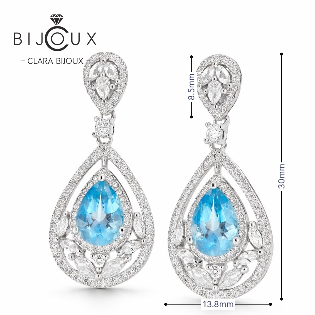 В центъра на всяка обеца блести естествен Swiss Blue топаз с тегло 3 карата – камък, известен с кристалната си чистота и дълбокото небесносиньо сияние. Формата „капка“ придава движение и деликатна женственост, а обрамчващите искрящи бели CZ камъни подсилват отблясъците на светлината и добавят усещане за бутиков завършек.