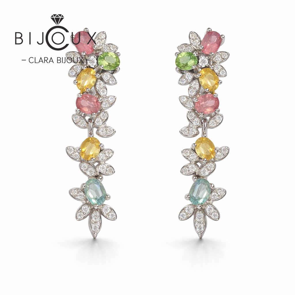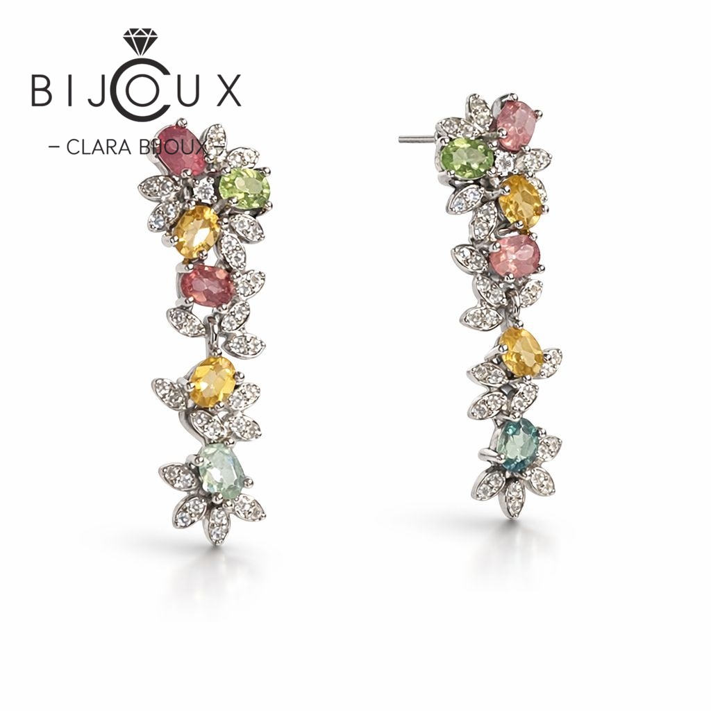 Висящи сребърни обеци естествен турмалин Clara Bijoux впечатляват с фин флорален дизайн и нежна композиция от многоцветни естествени камъни. Основният камък е естествен турмалин (Tourmaline) – ценен със своето богато разнообразие от цветове и естествена красота. Хармонията между розови, зелени, жълти и небесносини нюанси създава изключително елегантно и живо бижу, което привлича погледа.